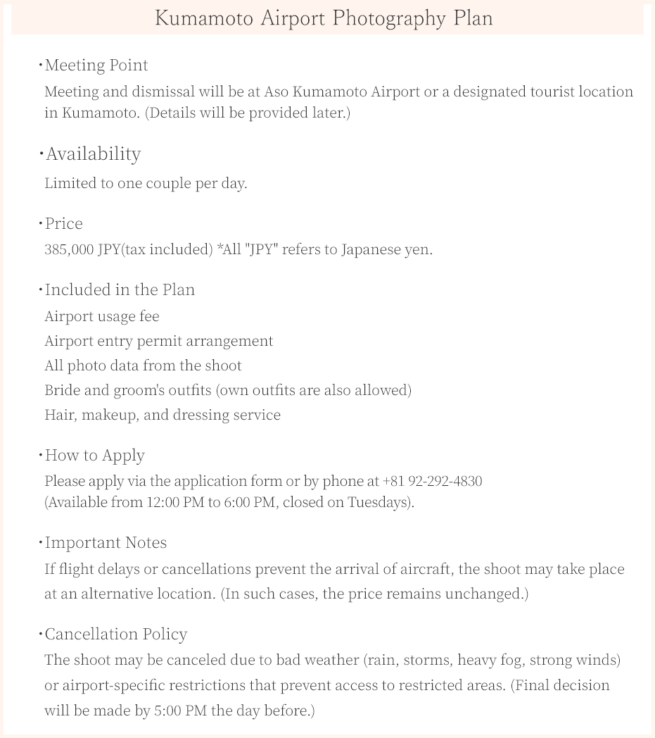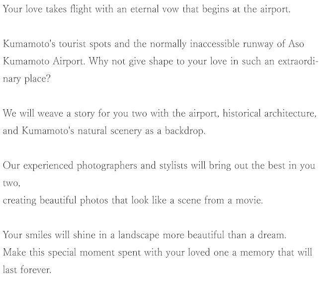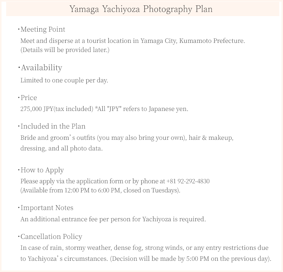 〒861-0531 Kumamoto Prefecture, Yamaga City, Naka 989-1 Business Hours: 9:00 - 18:00 Closed: Mondays Tel: +81 968-44-6277 Inquiries: +81 92-292-4830 Bridal